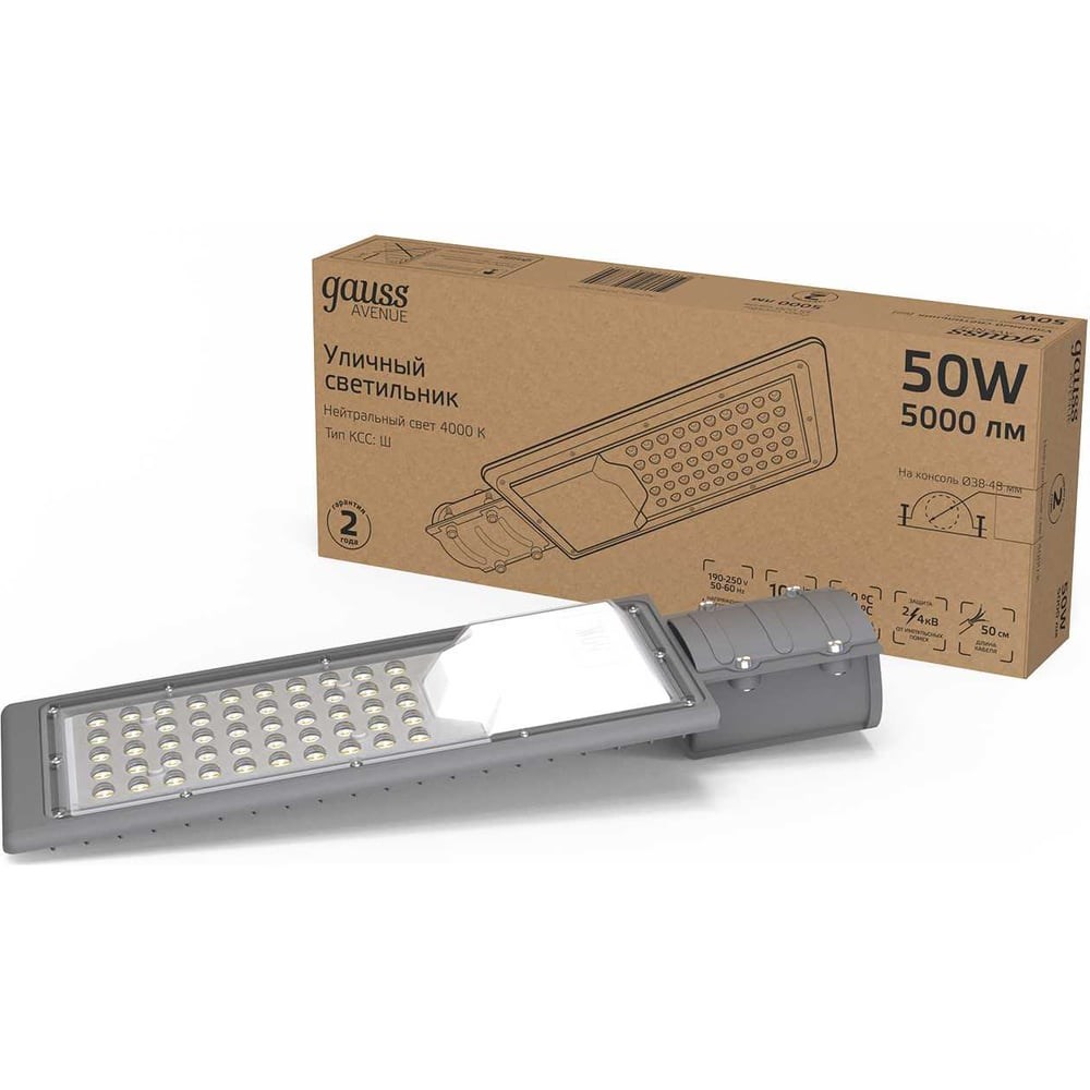 Уличный светодиодный консольный светильник Gauss серии "Avenue" предназначен для освещения автомобильных дорог с малой и средней интенсивностью движения, освещения улиц, дворов, парковых аллей и придомовых территорий рекомендуется использовать светодиодные светильники с распределением КСС типа «Ш» (широкая). Такими характеристиками обладают консольные уличные светильники серии "Avenue". Также светильник защищен от импульсных помех. Это важно, учитывая внешние факторы. Импульсные помехи в сети довольно распространены, они могут возникать во время грозы, при включении/выключении мощных нагрузок. Корпус оснащен анодированным алюминием. Технология анодирования добавляет к светильнику свойства коррозийной стойкости и сопротивление к механическим воздействиям.