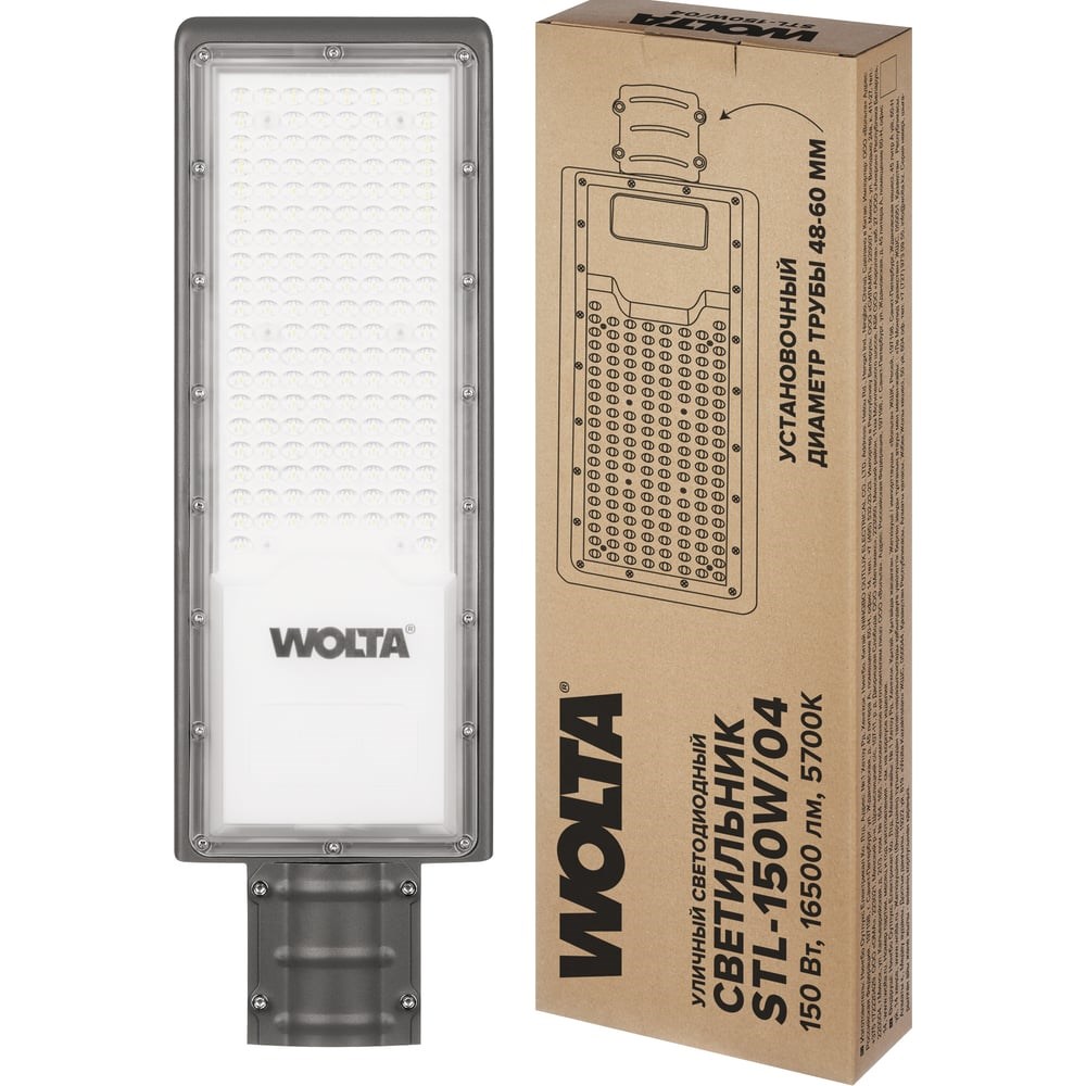 Уличный консольный светодиодный светильник Wolta LED 150Вт 15000лм 5700К Холодный свет IP65 STL-150W/04 консольный используется в различном уличном освещении. Крепится на стандартную консольную трубу 48мм или на торшерную опору 60мм. Корпус изготовлен из литого алюминия и покрыт порошковой краской. Подключение питания доступно и к шнуру, выведенному наружу светильника, и к клеммной колодке, расположенной внутри светильника. Светодиодные уличные светильники торговой марки WOLTA® STL-04 с широкой осевой кривой силы света (КСС), широко применяются для освещения автомобильных дорог различных категорий, а также улиц, открытых территорий спортивного и производственного назначения, парков и прогулочных дорожек, придомовых территорий, площадей, автостоянок. STL-04 являются энергоэффективной заменой традиционных светильников ГКУ, РКУ и ЖКУ. Высокие светотехнические характеристики. Эффективность светильника -110лм/Вт. Цветовая температура 5700К. Это оборудование со степенью защиты IP65, позволяющие ему эффективно работать в условиях повышенной влажности и пыли. Заказать светодиодные светильники Вы можете в режиме онлайн. Наши менеджеры предоставят всю сопутствующую информацию о товаре. Эффективность светильника -110лм/Вт Ресурс 50 000 часов Корпус из стойкого к коррозии алюминиевого сплава Компания WOLTA предоставляет гарантию на данные светильники - 2 года и сервис по замене товара. Мы гарантируем тройной контроль качества в собственной лаборатории.