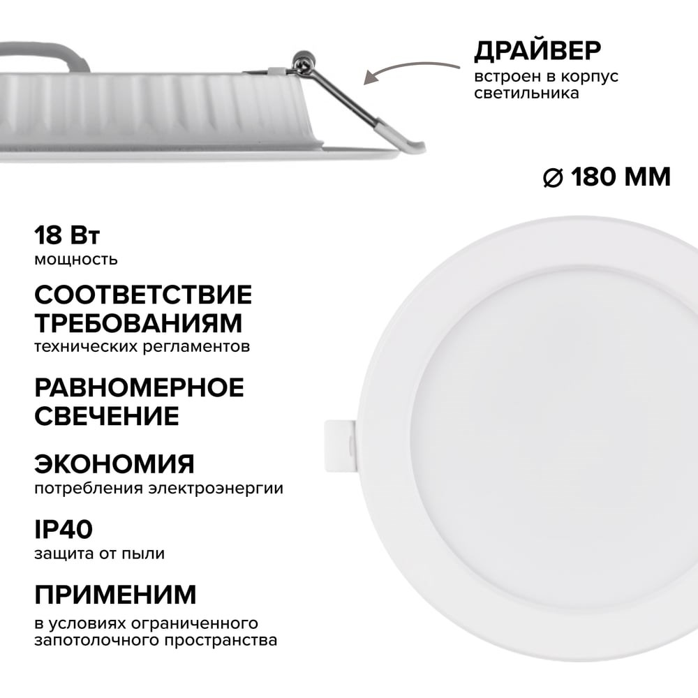 Wolta Светодиодный встраиваемый светильник 18 Вт , 1440 лм , круглый , 4000K Дневной белый , IP40 , панель DLUS-18W-4K со встроенным драйвером и световой отдачей до 80 лм/Вт.Благодаря равномерной засветке, отсутствию пульсаций и слепящего эффекта, DLUS идеально подходят для помещений с невысокими потолками. Широкий угол рассеяния 120° обеспечивает объёмный свет и большую площадь освещения. Даунлайты имеют высокий индекс цветопередачи ≥80 Ra, поэтому максимально точно передают цвета освещаемых объектов.Компания WOLTA предоставляет гарантию на светильники - 2 года и сервис по замене товара. Мы гарантируем тройной контроль качества в собственной лаборатории.Конструкция:Материал рассеивателя -ПолипропиленТип КСС - Д ;Косинусная, обозначение «Д», максимальная сила света распределена поперёк от 0 до 35 градусов и вдоль от 180 до 145 градусов.Класс защиты II. В светильнике второго класса, защита от поражения электрическим током обеспечивается усиленной или двойной изоляцией. Такие электросветильники не имеют специального устройства для защитного заземления и подпитываются с помощью двухпроводной однофазной сети.Климатическое исполнение УХЛ4. Категория размещения 4 предусматривает эксплуатацию в крытых помещениях с отоплением и с искусственной вентиляцией (регулирование температурных условий, нет низких температур, низкая концентрация пыли).