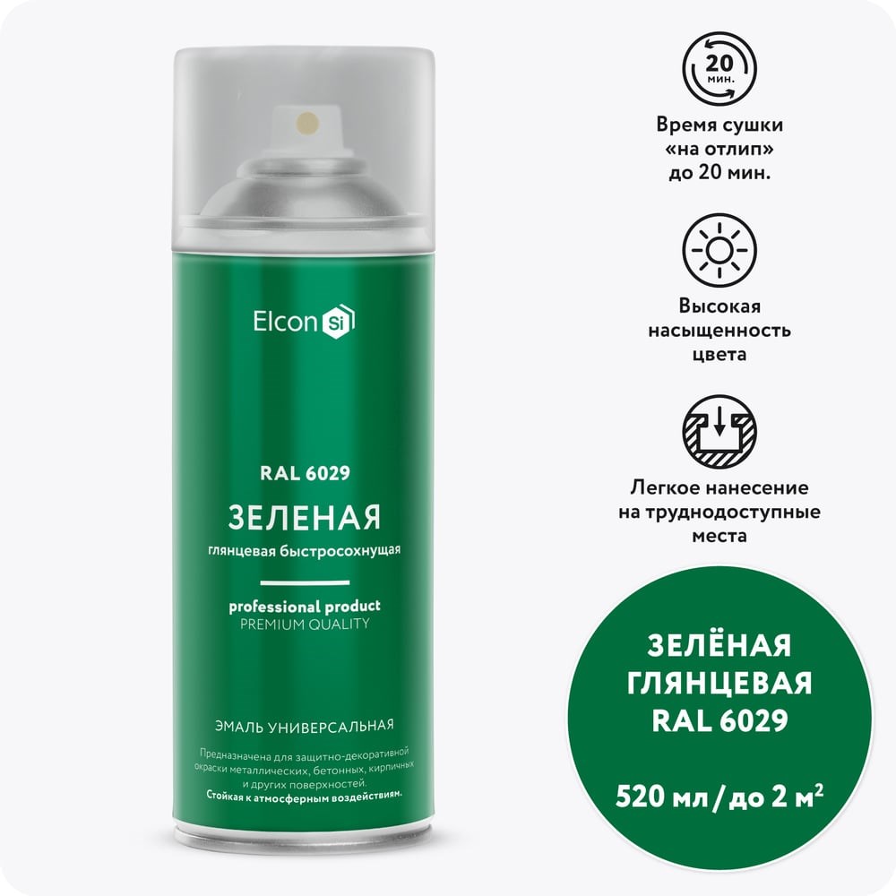 Универсальная быстросохнущая акриловая аэрозольная эмаль Elcon ral 6029 зеленая, глянцевая, 520 мл 00-00462824 предназначена для окрашивания металлических, бетонных, деревянных, пластиковых, керамических и других поверхностей. Обеспечивает отличный результат для любых декоративных и оформительских работ. Применяется для наружных и внутренних работ. Эмаль легко наносится на труднодоступные места, имеет хорошую укрывистость и адгезию. Готовое покрытие характеризуется долговечностью и атмосферостойкостью. Имеет яркий, насыщенный цвет. Для улучшения адгезии рекомендуется предварительно загрунтовать поверхность Акриловым грунтом Elcon