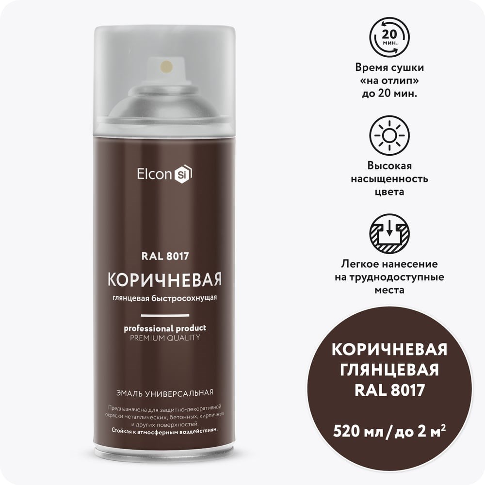 Аэрозольная краска Elcon "Эмаль универсальная быстросохнущая RAL в баллончике" Акриловая, Глянцевая, Коричневая RAL 8017, аэрозоль 520 мл 00-00462826 предназначена для окрашивания металлических, бетонных, деревянных, пластиковых, керамических и других поверхностей. Обеспечивает отличный результат для любых декоративных и оформительских работ. Применяется для наружных и внутренних работ. Эмаль легко наносится на труднодоступные места, имеет хорошую укрывистость и адгезию. Готовое покрытие характеризуется долговечностью и атмосферостойкостью. Имеет яркий, насыщенный цвет. Для улучшения адгезии рекомендуется предварительно загрунтовать поверхность Акриловым грунтом Elcon