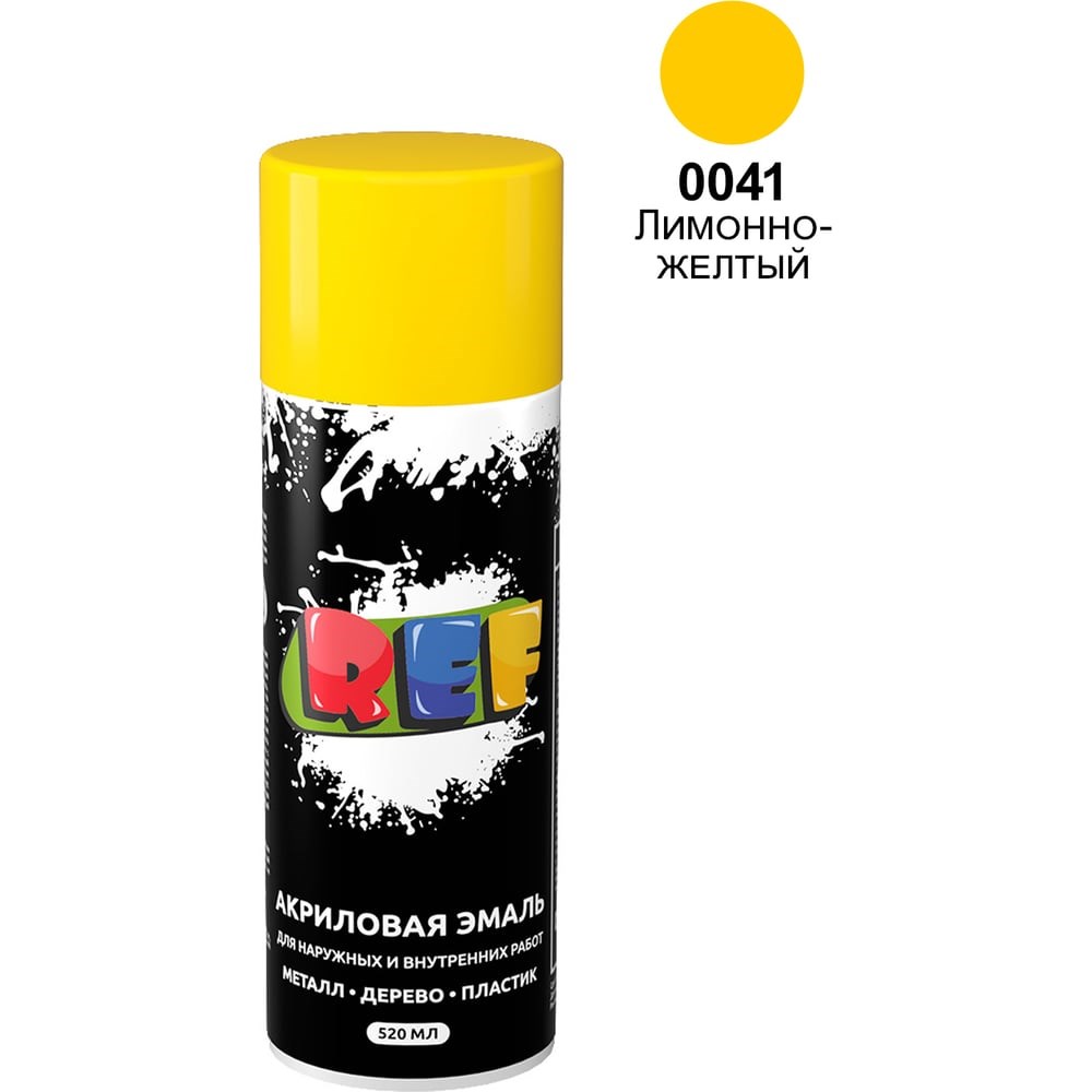 Акриловая универсальная эмаль REF лимонно-желтый 520 мл 0041 предназначена для защитно-декоративного окрашивания различных поверхностей внутри и снаружи помещений. Продукт широко используют во время строительных работ, ремонта автомобилей и оформления интерьеров. Быстросохнущий состав отличается высокой укрывистостью и хорошей адгезией к большинству материалов (металл, дерево, пластик). Краска образует равномерное покрытие, устойчивое к механическим (удары, износ, царапины, изгибы) и неблагоприятным атмосферным (осадки, перепады температуры, ультрафиолет) воздействиям.