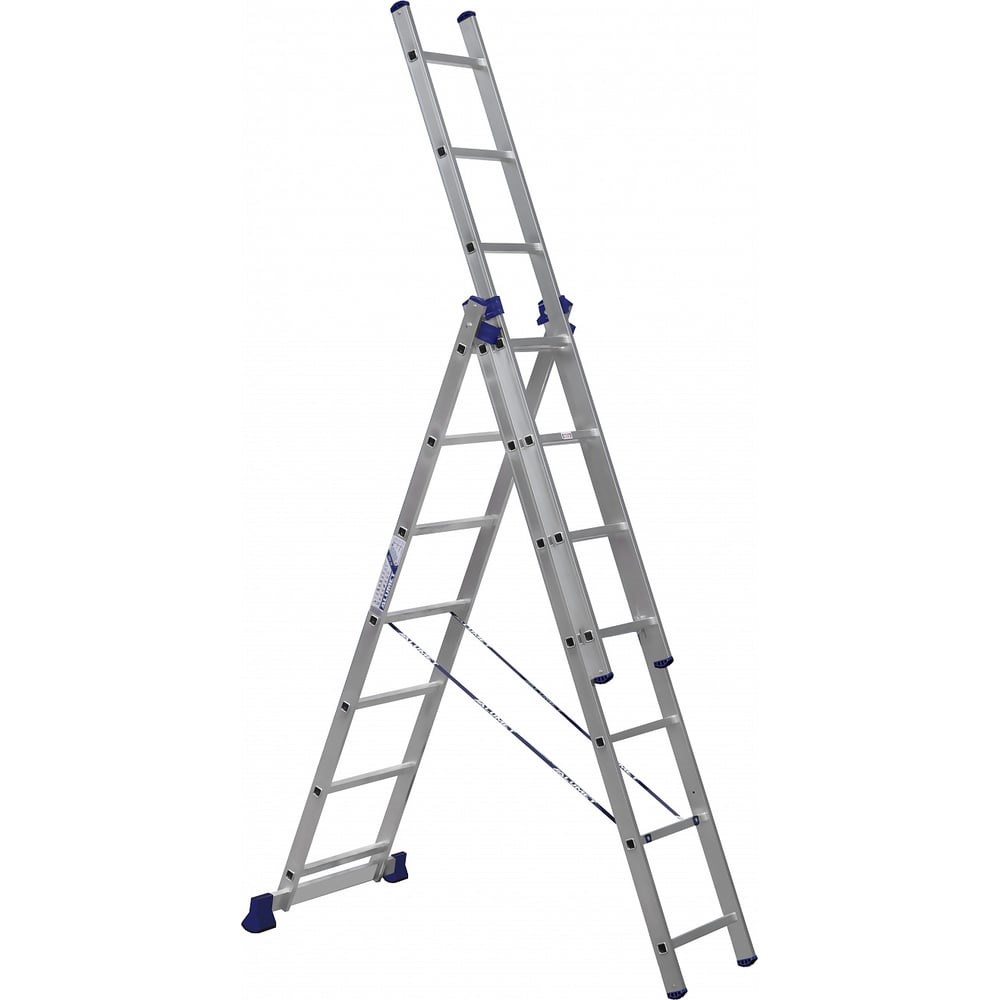 Лестница алюминиевая трехсекционная универсальная– замечательный выбор для проведения работ на высоте.Тетивы, ступени и стабилизатор изготовлены из высокопрочного алюминиевого сплава (ГОСТ 22233). Лестница является разборной.Ее конструкция позволяет изменять конфигурацию в зависимости от требований и задач. Может использоваться как приставная лестница или стремянка.Узкая секция может применяться, как самостоятельная приставная лестница,что делает ее чрезвычайно универсальной и удобной в различных ситуациях.Алюминиевый сплав обеспечивает изделию прочность и легкость. Продуманное расположение ступеней создает оптимальные условия для подъема и безопасного удержания на высоте.Идеальный помощник как на производстве, так в офисе, быту или на даче.Лестницу можно использовать вне помещения. Конструкция стойкая к воздействию неблагоприятных погодных условий благодаря коррозионностойким свойствам алюминия. Этот фактор является одним из главных преимуществ модели перед аналогичными решениями из других материалов.!!!Универсальность конструкции позволяет доукомплектовать лестницу: дополнительными Заглушками ZGL, Опорой на стену АК001, АК002, Кронштейном для крыши АК003, Универсальным креплением для лестниц на багажник автомобиля АК010, стабилизаторомSTB!!!Завод – изготовитель оставляет за собой право в одностороннем порядке вносить изменения в конструкцию, в целях улучшения технических характеристик.на линейные размеры отклонение может составлять +-5 мм, на вес изделия +-5%