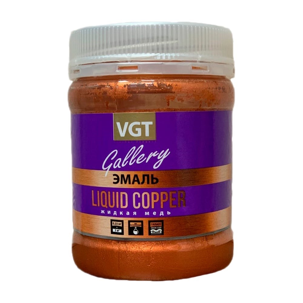 Универсальная эмаль VGT ВД АК 1179 Перламутровая Жидкая медь 0,23 кг 11607628 предназначена для декоративной отделки элементов стен, мебели, лепнины, кованых изделий и декоративных предметов интерьера. Создаёт на поверхности плотное перламутровое покрытие с декоративным эффектом, имитирующим блеск благородного металла.