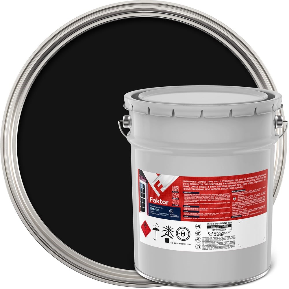 Эмаль ЯРОСЛАВСКИЕ КРАСКИ FAKTOR ПФ-115 черная, барабан 20 кг 214738 универсальная сверхпрочная предназначена для окрашивания металлических, деревянных и бетонных поверхностей, эксплуатируемых в атмосферных условиях и внутри помещений (наружные стены, элементы фасадов, скамьи, ограды, оконные рамы, двери, проемы, подоконники и т. д.) После высыхания образует особо прочное полуматовое покрытие, стойкое к атмосферным воздействиям и перепадам температур.