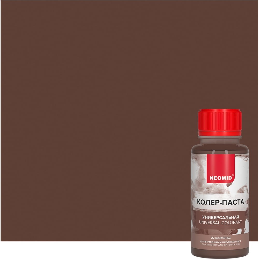 Колер-паста универсальная NEOMID Палитра №1 (22 шоколад) 100 мл Н-КолПаста-22-шок предназначена для колеровки акриловых, латексных, водно-дисперсионных (ВД), алкидных (ПФ, ГФ), масляных (МА), нитроцеллюлозных (НЦ) красок и эмалей, лаков, декоративных штукатурок, шпатлевок, известковых и цементных растворов, затирок для швов и др. составов.