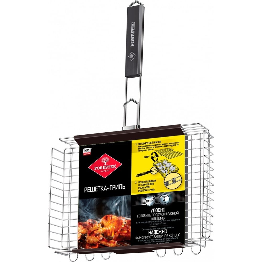 Универсальная решетка-гриль Forester с регулируемой высотой, 24х37 см BQ-N05 предназначена для приготовления мяса, птицы, рыбы, овощей на углях. Изготовлена из стали с коррозионностойким покрытием. Ручка оснащена вставкой из дерева. Конструкция имеет регулируемый объем, что позволяет запекать продукты разной толщины (от 0.5 см до 4.5 см). Специальные предохранители надежно фиксируют решетку, предохраняя от случайного раскрытия.