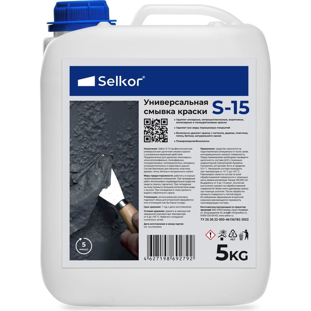 Универсальная смывка краски Selkor s15 5 кг 55110 - профессиональная универсальная щелочная смывка краски с ускоренным временем действия. Предназначена для удаления эпоксидных, эпоксиполиэфирных, полиэфирных, полиуретановых, полиакрилатных, алкидных, нитроцеллюлозных и акриловых красок. Состав безопасен для металла, пластика, дерева, гипса, бетона и натурального камня. Применение: Средство наносится на подготовленную (очищенную от пыли, грязи, консервационных смазок) поверхность. Перед применением необходимо проверить щелочность состава (рН) с помощью индикаторной (лакмусовой) бумажки. Показатель рН должен быть в пределах 9,5-11. Нанесение состава проводить при температуре от +5˚С до +25˚С. Равномерно нанести состав по всей обрабатываемой поверхности с помощью кисти, валика или ветоши. Расход 150-250 г/м². Выдержать от 3 до 15 минут, исключая высыхание смывки на обрабатываемой поверхности! Затем снять удаляемую краску при помощи шпателя. После обработки промыть поверхность теплой водой. Во избежание образования вторичной коррозии рекомендуется применять пассивирующие составы.