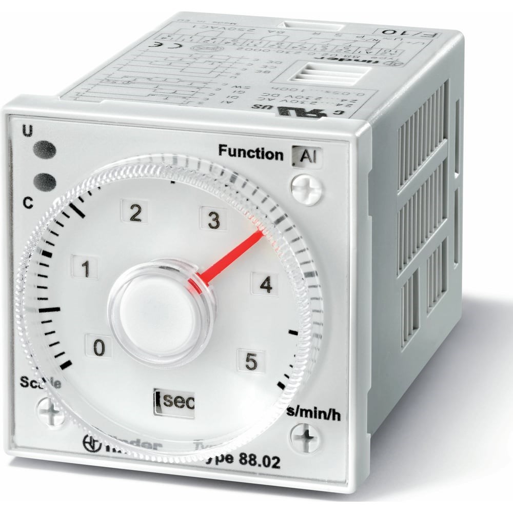 Дополнительные характеристики универсального многофункционального реле времени Finder для монт. на лицевую панель, 11 пин разъём, 880202300002: Номинальное напряжение катушки - 24-230 В. 11-штырьковый разъем. Установка на переднюю панель щита. Розетки 90 серии. Временные промежутки от 0.05 с до 100 ч. Функции: AI: Задержка включения, DI: Интервалы, GI: Импульсы с задержкой, SP: Симметричный повтор цикла (начальный импульс ВЫКЛ), BE: Задержка отключения с управляющим сигналом, CEa: Задержка включения и отключения с управляющим сигналом, DE: Интервалы по управляющему сигналу при включении. Контактная группа - 2 CO (DPDT).