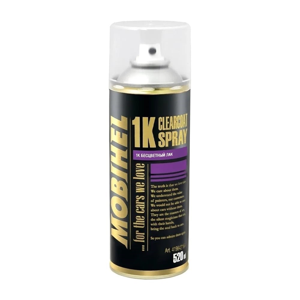 Универсальный акриловый лак Mobihel (глянцевый; аэрозоль; 520 мл) 41984216A в аэрозольной упаковке, удобен для локального ремонта. Достоинством лака является очень короткое время сушки в естественных условиях и высокий блеск. Аэрозольный лак Mobihel от Helios отличается особым качеством, можно даже полировать. Поверхности, пригодные для нанесения: автомобильные заводские или ремонтные покрытия в хорошем состоянии. Поверхности с нанесенным базовым покрытием. Камень, стекло, дерево, автомобильные пластики. Аэрозольные материалы ускоряют процесс авторемонта, используются как для проведения локального ремонта, так и для осуществления полного цикла окраски без применения окрасочного оборудования. Продукт в баллоне состоит из краски, разбавителя и газа-вытеснителя (пропеллента). Соотношение этих компонентов подобрано таким образом, чтобы работа баллона была наиболее эффективной. А это значит, что самостоятельный кузовной ремонт или окраска других предметов на высоком уровне стала доступна каждому. Несмотря на высокое качество аэрозольных продуктов, для создания премиального уровня лакокрасочного покрытия двухкомпонентные материалы предпочтительнее в силу особенностей полимеризации, а именно своей необратимости. Поэтому часто аэрозольная продукция применяется для локального ремонта, а для больших ремонтных поверхностей используются двухкомпонентные материалы.