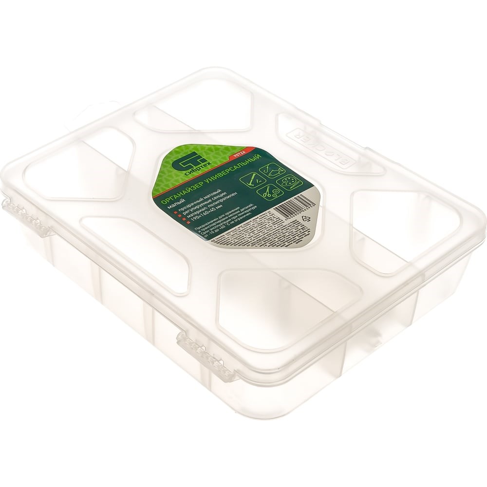 Универсальный малый органайзер Сибртех 90726 размером 190 х 160 х 45 мм, прозрачный матовый, используется для практичного хранения мелких предметов. Он подходит для распределения снастей, крепежа, хозяйственных мелочей и других предметов. Органайзер позволяет компактно расположить вещи в скрытых уголках квартиры: в шкафу, под кроватью и т.д.