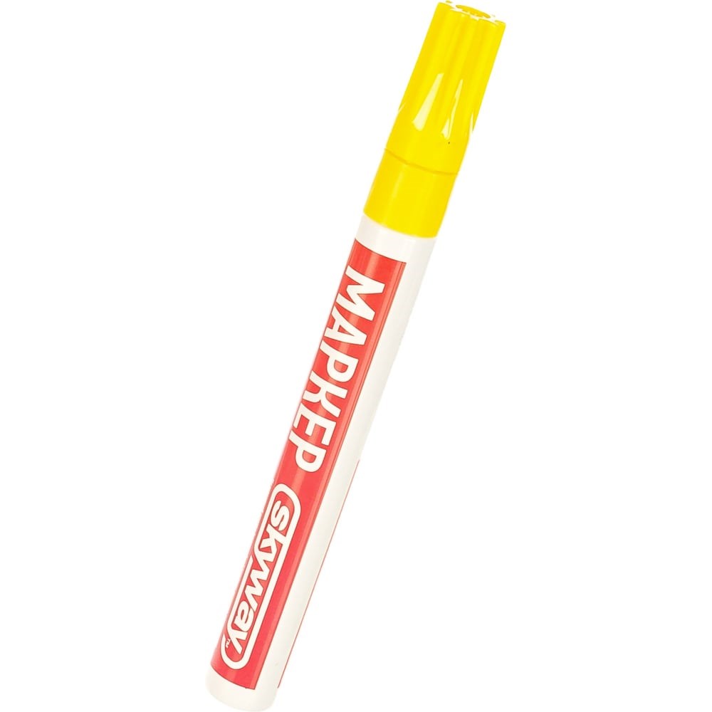Маркер SKYWAY универсальный с наконечником из фетра, цвет желтый - маркер на масляной основе, водостойкий, со средней толщиной наконечника. Подходит для нанесения на различные поверхности: вы можете сделать надпись на металлической трубе, дереве, стекле или компакт-диске. Универсальный маркер удобно держать в руке. Корпус изготовлен из металла, который не гнется и сохраняет форму.Инструкция по применениюОчистите обрабатываемую поверхность от всех видов загрязнений.Хорошо встряхните маркер перед применением.Откройте колпачок и прижмите наконечник к поверхности.Держите маркер строго вертикально до тех пор, пока не начнут выступать чернила.После использования закройте колпачок до щелчка.