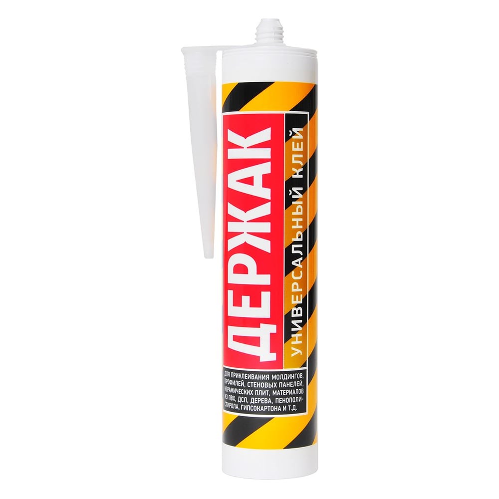 Монтажный универсальный клей «Держак» Универсальный монтажный клей «Держак» предназначен для внутренних и наружных работ. Обладает высокой влагостойкостью и термостойкостью, при склеивании образует прозрачный шов, подходит для работы с различными материалами.Для приклеивания - молдингов и профилей (плинтусов, панелей, наличников, углов, кабель-каналов); - стеновых панелей из дерева, ПВХ, пробки; - облицовочной плитки, паркета, керамических плит; - изоляционных панелей; - материалов из ПВХ, ДСП, дерева, пенополистирола, гипсокартона и т.д. Применяется для приклеивания указанных материалов к штукатурным, гипсокартонным, бетонным, кирпичным и деревянным поверхностям. Для внутренних и наружных работ. Не подходит для приклеивания: полиэтилена. Способ применения: склеиваемые поверхности очистить от пыли и грязи, удалить непрочно держащиеся элементы. Склеиваемые поверхности должны быть сухими. Клей нанести полоской или точечно при помощи пистолета на одну из поверхностей. Сильно прижать и удерживать в течение 15 секунд для обеспечения схватывания. При приклеивании тяжелых предметов, на время полного высыхания, установить опоры. Температура нанесения клея: от +5 до +35. Время высыхания клея составляет 20-30 минут, полная прочность достигается спустя 24 часа. Меры предосторожности: во время работ и после их завершения помещение проветрить до исчезновения запаха клея. Не допускать попадания внутрь и в глаза. При работе применять защитные перчатки.