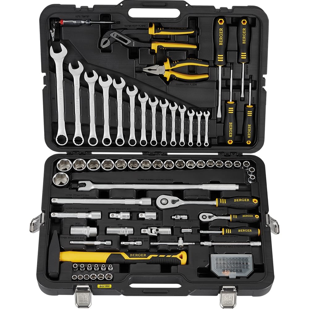 Универсальный набор инструментов 102 шт Berger BG BG102-1214 содержит большое количество разнообразных ручных инструментов, бит и насадок, для выполнения различных монтажных и ремонтных работ. Все компоненты хранятся в удобном, закрывающемся кейсе, в котором предусмотрены отдельные ложементы для каждого инструмента.