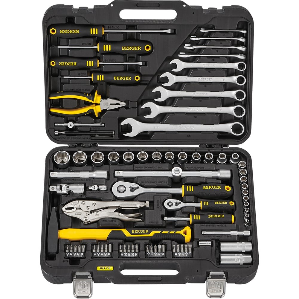 Универсальный набор инструментов 78 предметов Berger BG BG078-1214 поможет выполнить множество ремонтных и монтажных работ. Все изделия изготовлены из высокопрочной хромованадиевой стали. Инструменты проходят двойной контроль коррозионной устойчивости. Для удобной работы некоторые предметы оснащены эргономичными рукоятками, которые не скользят и удобно фиксируются в руке, что создает комфорт в работе. Набор поставляется в кейсе, для удобного хранения и транспортировки.