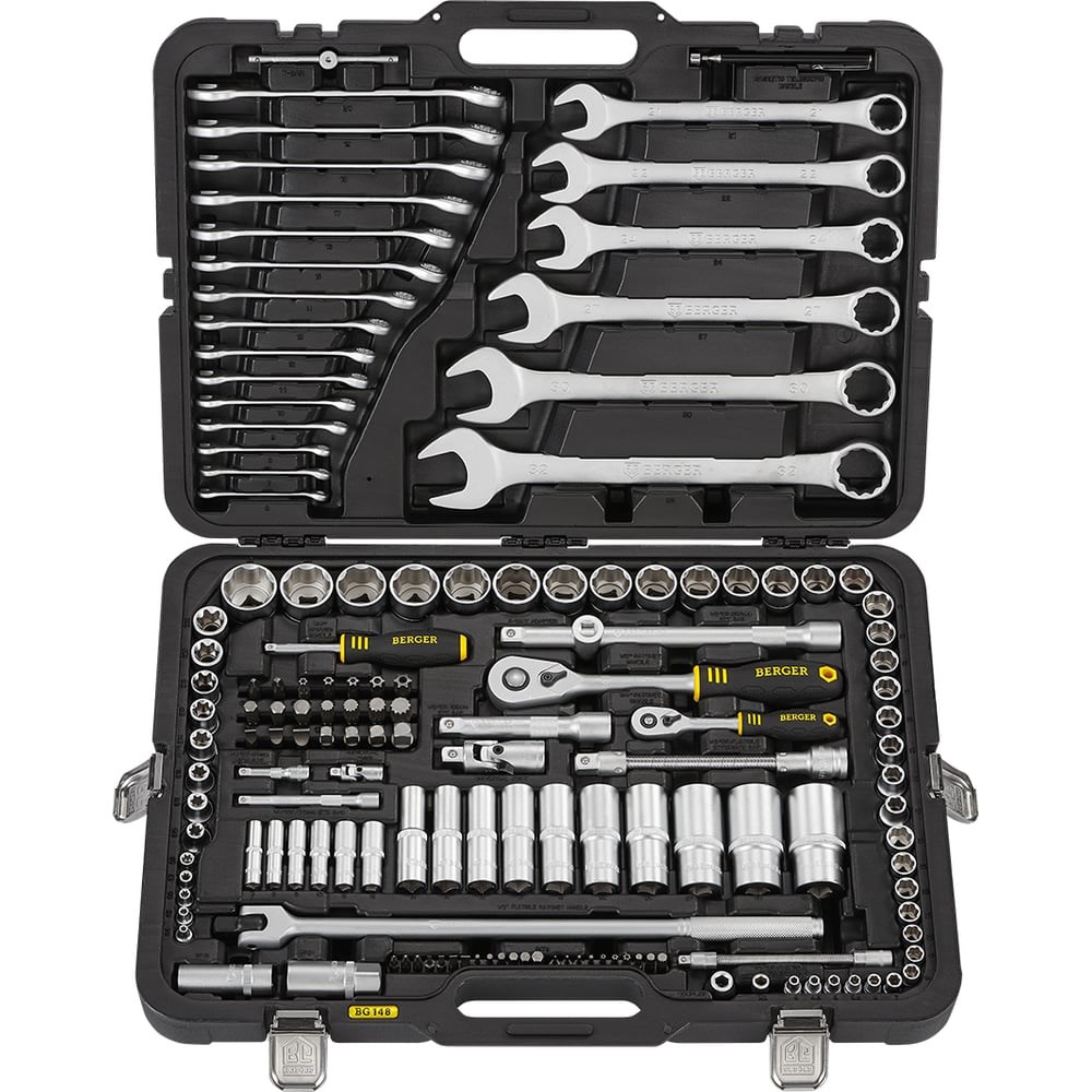 Универсальный набор инструментов Berger BG 148 предметов BG148-1214 состоит из необходимых для ремонта автомобилей изделий. Комплект поставляется в кейсе с защелками для надежного и долговечного хранения, а также комфортной транспортировки. Инструменты в количестве 148 предметов изготовлены из хромованадиевой стали, стойкой к нагрузкам. Рукоятки выполнены из резинопластика.