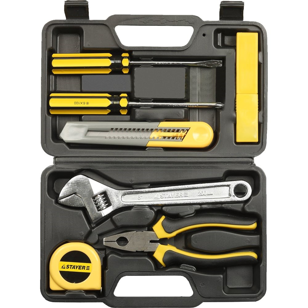 В универсальный набор для ремонтных работ STAYER 2205-H8 входят самые разнообразные инструменты, которые нужны в каждом доме. Подходит для ремонтных, столярных и слесарных работ. Весь инструмент выполнен из качественной инструментальной стали. Внимание! Тестер в комплект поставки не входит.