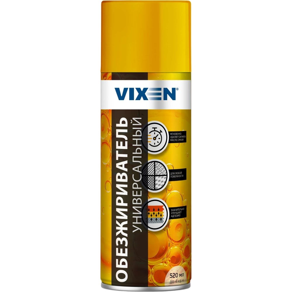 Универсальный обезжириватель VIXEN аэрозоль, 520 мл VX90003 быстро и эффективно очищает трудноудаляемые загрязнения, такие как масло, жир, смазка, силикон, остатки клея и наклеек. Подготавливает поверхность к нанесению лакокрасочных и антикоррозийных материалов, а также к склеиванию и герметизации, обеспечивая высокую адгезию. Быстро испаряется, не оставляет следов и не вызывает коррозию Значительно облегчает обработку изделий сложной формы Используется для обезжиривания любого вида поверхности: металлической, пластиковой, стеклянной, деревянной, керамической и др. Может использоваться при ремонте и обслуживании автотранспорта, в быту и производстве Подходит для наружных и внутренних работ Рекомендации по использованию Защитите необрабатываемую поверхность полиэтиленовой пленкой Энергично встряхните баллон перед использованием Нанесите состав на предварительно очищенную от рыхлой грязи поверхность Удерживая баллон в вертикальном положении, нанесите средство на обрабатываемую поверхность с расстояния 20-30 см. При обработке больших по площади поверхностей периодически встряхивайте баллон. Излишки средства удалите чистой салфеткой При необходимости повторите обработку Перед обработкой поверхности рекомендуется опробовать действие средства и стойкость обрабатываемой поверхности (особенно пластиков) на небольшом малозаметном участке