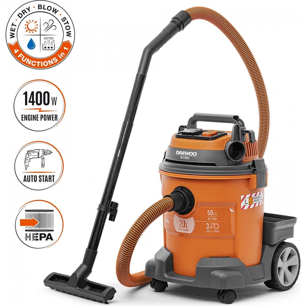 Преимущества Розетка для электроинструмента Встроенная розетка позволяет подключать к нему электроинструменты мощностью до 2 кВт. Автоматическое включение пылесоса при начале использования инструмента и отключение с задержкой для удаления грязи из шланга. База с местом для хранения аксессуаров База с увеличенными колесами и отделом для хранения необходимых аксессуаров. Бак из ударопрочного пластика Корпус пылесоса выполнен из современного, ударопрочного пластика с толщиной стенки 3 мм. Стойкий к механическим воздействиям и коррозии. Объем бака 20 л. Режим обратного выдувания Функция обратного выдувания3000 л/мин позволяет очистить рабочее место от опилок и стружки, сдуть листву с дорожек или прочистить водосток или канализацию. Шланг увеличенной длины 3 м Шланг длиной 3 м позволяет собирать строительный мусор на высоте, без необходимости поднимать пылесос. Возможность сбора воды Функция всасывания и откачки воды позволяет эффективно собирать жидкость с любого покрытия в объеме до20 литров. Автоматическая остановка всасывания для предотвращения попадания жидкости в двигатель.