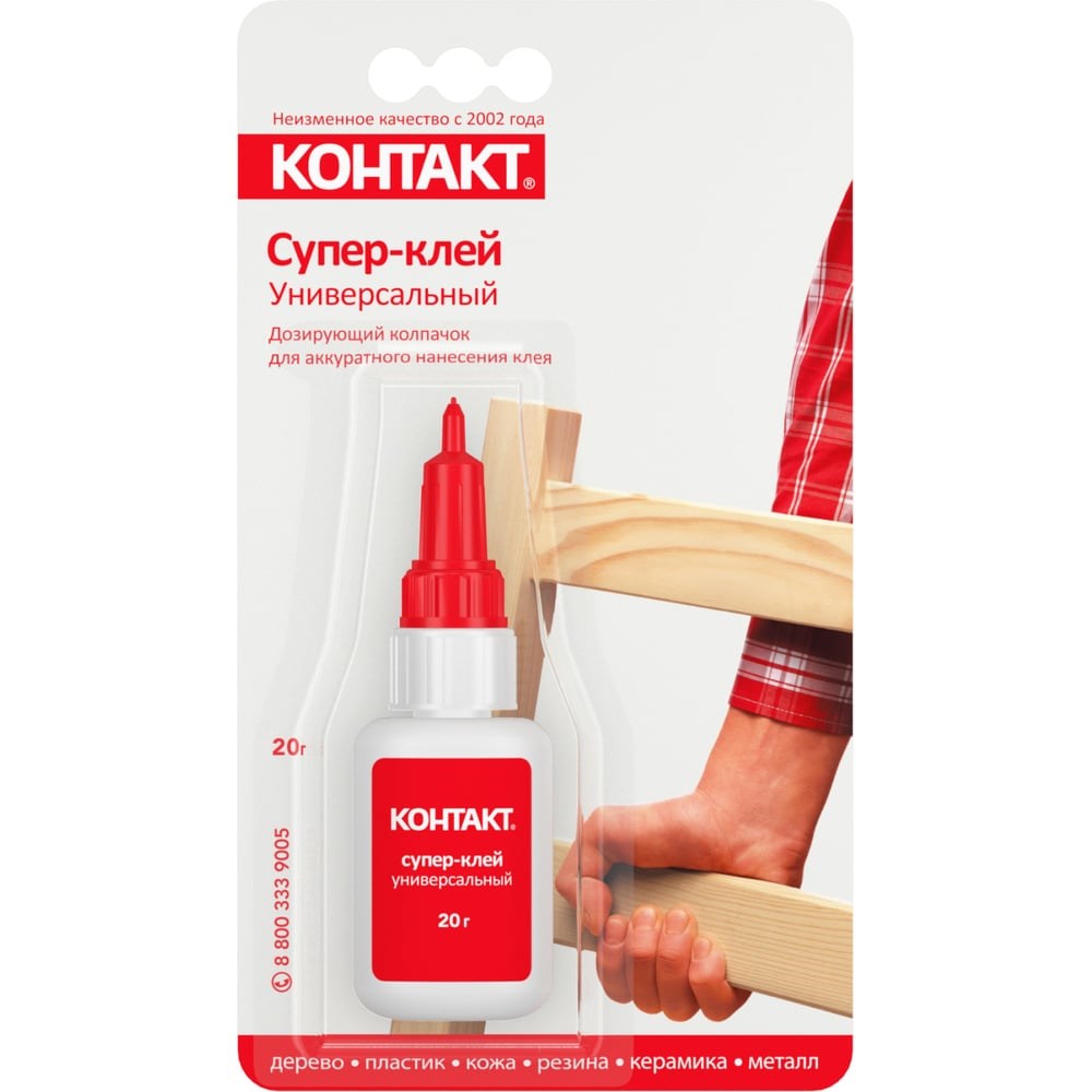 Супер-клей “КОНТАКТ” универсальный, цианакрилатный – многократное использование до последней капли. Дозирующий самоочищающийся колпачок. Идеальное решение для бытового и профессионального применения, где требуется мгновенная адгезия, термостойкость и долговечность.СКЛЕИВАЕТ В ЛЮБОМ СОЧЕТАНИИ • дерево • пробка • пластик • кожа • резина • фарфор • керамика • металл100% РЕЗУЛЬТАТ Между склеиваемыми поверхностями не должно быть зазора. Чем больше площадь склеиваемых поверхностей, тем выше прочность склеивания. Объём 20 г – подходит для масштабных задач (ремонт мебели, техники, сантехники).Однокомпонентный моментальный клей на основе этилцианакрилата обеспечивает сверхпрочное соединение материалов за 5-20 секунд с полной фиксацией через 10-15 минут.Супер клей секундный не предназначен для работы с полиэтиленом, полипропиленом, тефлоном. Не рекомендуется использовать для склеивания поверхностей, контактирующих с пищей.
