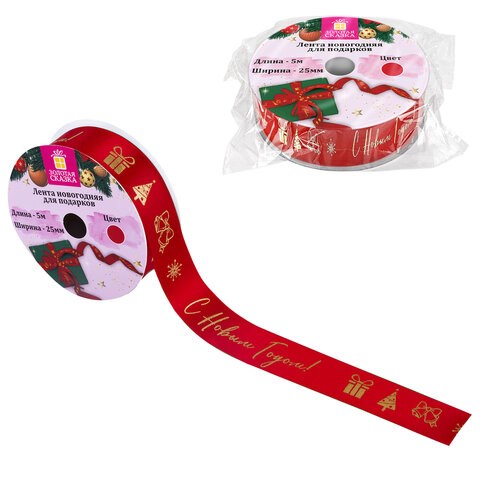 Упаковочная лента новогодняя для декора и подарков 25 мм х 5 м, КРАСНАЯ, с тиснением, ЗОЛОТАЯ СКАЗКА, 592414