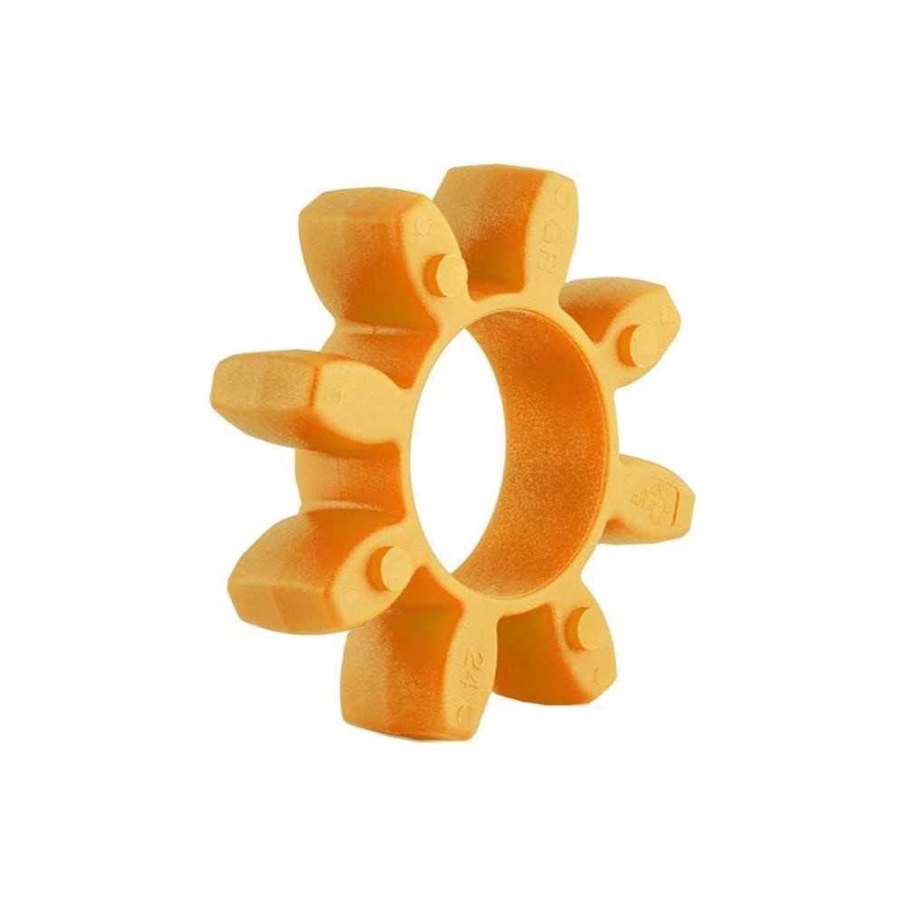Упругий элемент типа паук желтый предназначен для осуществления упругой связи между соединительными муфтами кулачкового типа. Конструкция эластичного элемента имеет 8 лучей. Изготовлен из полиуретана желтого цвета. Ему соответствует твердость 92 Shore A.