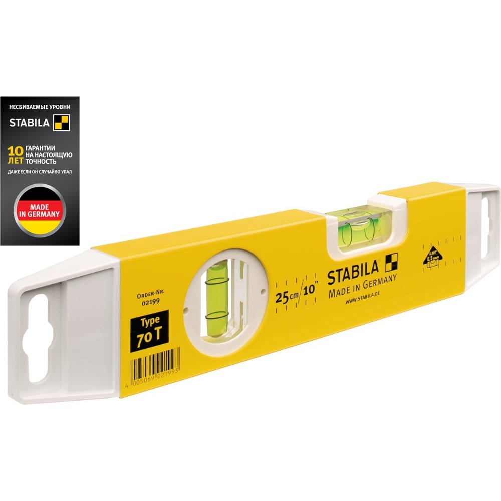 Уровень тип 70Т, 25 см STABILA 02199 благодаря небольшим размерам удобен для проведения измерений и выверки поверхностей в стесненных условиях. Позволяет отслеживать отклонения конструкции как по вертикали, так и по горизонтали. Профиль выполнен из легкого металла, порошковое покрытие повышает срок службы.