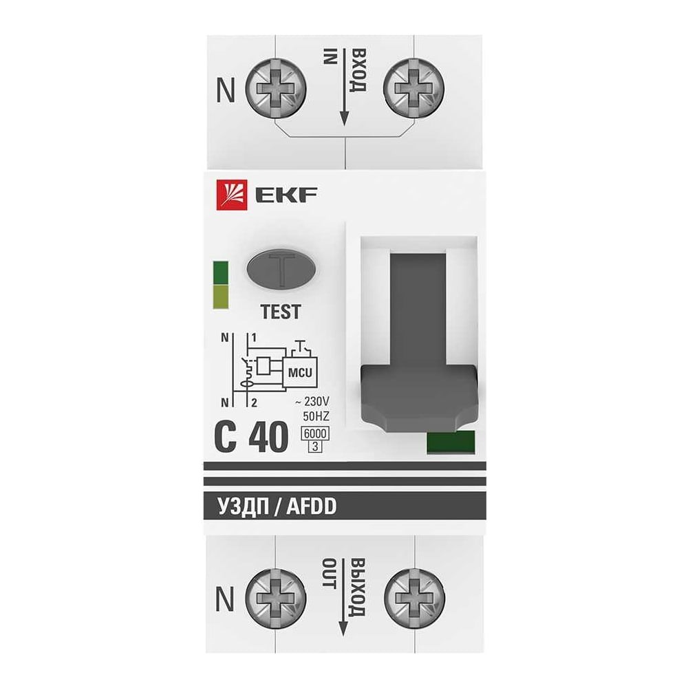Дополнительные характеристики устройства защиты от дугового пробоя EKF (УЗДП) с автоматическим выключателем 1P+N 40А (C) 6кА PROxima afdd-2-40C-pro: С сигнальной лампой (индикатором). Характеристика срабатывания (кривая тока) - С.Номинальное выдерживаемое импульсное напряжение, кВ - 4. Климатическое исполнение и категория размещения - УХЛ4. Вариант монтажа - На DIN-рейку. Предупреждение пожара за счет обнаружения и ограничения тока дуги. Снижение риска возгорания под воздействием токов дугового замыкания. Проведение тока в нормальном режиме. Оперативное управление участками электрических цепей. Защита от токов перегрузки и короткого замыкания. Количество полюсов - 1P+N.