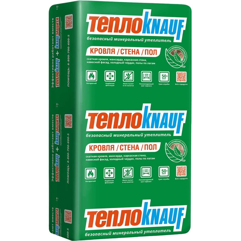 Утеплитель для кровли и стен Knauf Insulation TеплоКНАУФ (100x610x1230 мм; 6 кв. м; 8 плит в упаковке) 751541 разработан для скатных кровель и наружных стен малоэтажных зданий. Пропуская достаточное количество воздуха для обеспечения оптимального уровня вентиляции, материал обладает высокой способностью к теплосбережению Микроволокна этой минеральной ваты пропитаны водоотталкивающей пропиткой, благодаря чему существенно повышается устойчивость утеплителя к влаге и другим влияниям окружающей среды При производстве используется связующее на основе натуральных компонентов, без использования фенол-формальдегидных и акриловых смол, что позволяет выпускать безопасный и экологичный материал Материал не ломается при изгибе, восстанавливает свою форму при воздействиях и перемещениях в процессе монтажа, не сползает в каркасе Не является пищей для грызунов, не способствует росту бактерий, плесени и грибка Применение: Кровля: скатная кровля между/над/под стропилами, мансарда, холодный чердак Стены: стены снаружи, каркасные стены