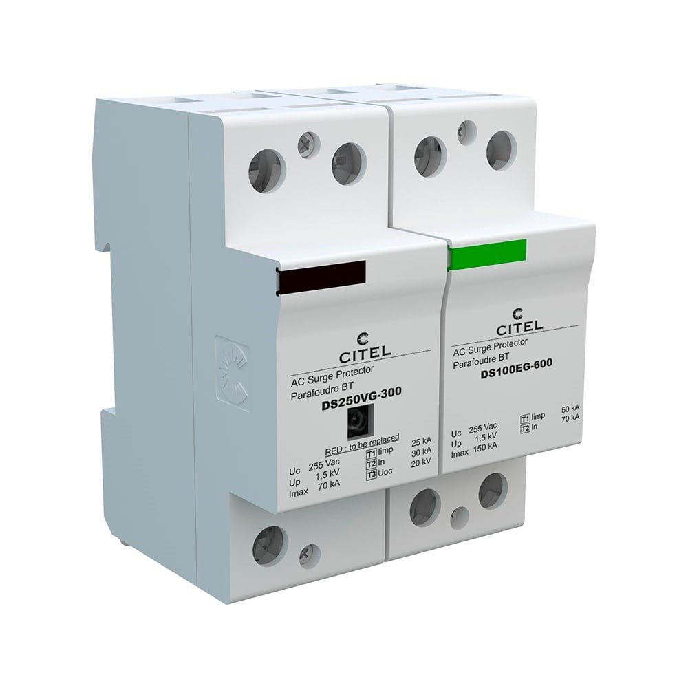 CITEL DS252VG-300/G — однополюсное устройство защиты от импульсных перенапряжений тип 1+2+3 для однофазных сетей 230 В с конфигурацией TT или TN. Обеспечивает комплексную защиту от прямых грозовых токов, коммутационных и остаточных перенапряжений. Реализованная технология VG (варистор + газоразрядник) исключает токи утечки, обеспечивая совместимость с УЗО. Устройство оснащено механической индикацией, встроенным терморазмыкателем и перекидным контактом для удалённой сигнализации.Основные характеристики:Тип УЗИП: 1+2+3, технология VGСеть: 230 В AC, однофазная, TT/TNМаксимальное напряжение (Uc): 255 В ACИмпульсный ток (Iimp): 25 кА (10/350 мкс)Максимальный ток разряда (Imax): 70 кАУровень защиты (Up): ≤ 1,5 кВКонтакт сигнализации: есть (перекидной)