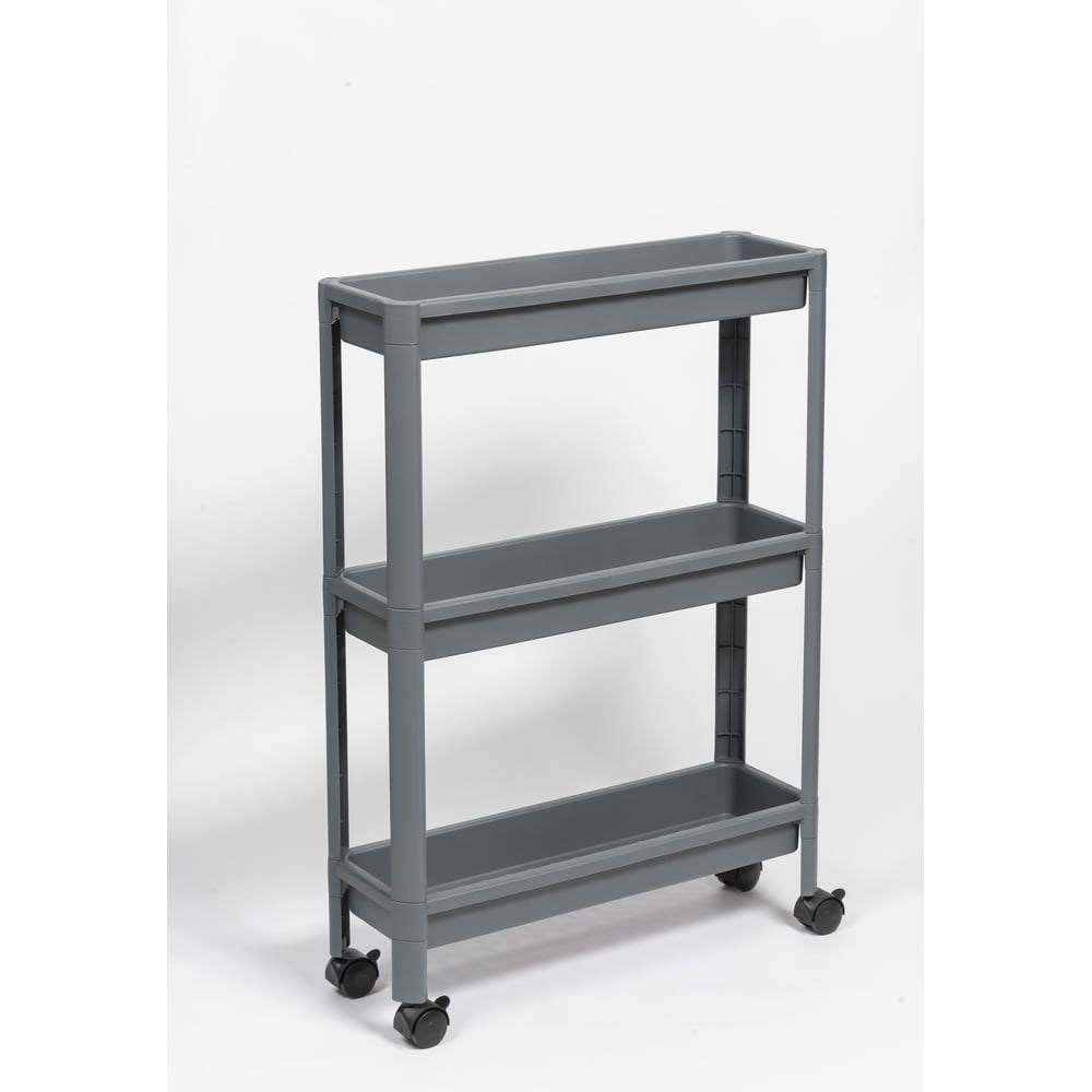 Этажерка Violet VIKEA узкая, 3-х ярусная, на колесах, серая 782318 – идеальное решение для организации пространства на кухне и в ванной, в гостиной и на балконе, а также в любом другом помещении. Прекрасно впишется в пространство любой комнаты. Состоит из нескольких ярусов. Имеет оптимальное расстояние между полками. Это позволяет разместить все самые необходимые полезные в хозяйстве мелочи. Стойки надежно соединяются внутренним замком, что обеспечивает монолитность конструкции и дает возможность поднять и переместить этажерку за верхнюю полку. Каркас этажерки выполнен из прочного пластика и не прихотлив в уходе. Достаточно протереть влажной тряпкой или промыть под струей теплой воды. Узкий стеллаж оснащен четырьмя небольшими колесами с фиксаторами для свободного перемещения, благодаря которым этажерка становится мобильной и многофункциональной. Изделие безопасно, не имеет острых углов и изготовлено из экологичного материала, не содержащего бисфенол А и предназначенного для контакта с пищевыми продуктами. Изделие поставляется в разобранном виде в индивидуальной коробке.