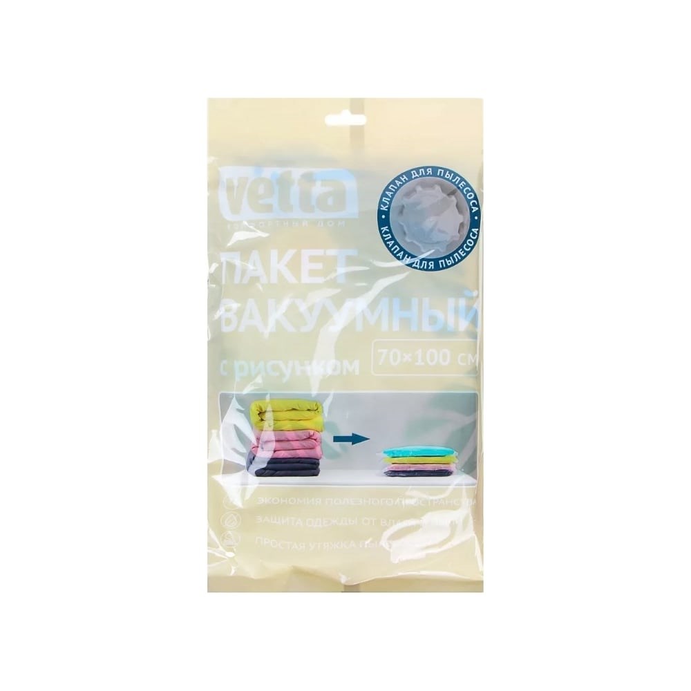 Вакуумный пакет VETTA с клапаном, работает от пылесоса, 70x100 см, с рисунком 457-058 предназначен для бытового использования. Позволяет организовать компактное хранение вещей, что экономит место при транспортировке. Имеет клапан для откачки воздуха, за счет чего удобен в использовании. Защищает содержимое от пыли, влаги, насекомых и запахов, поэтому отличается практичностью.