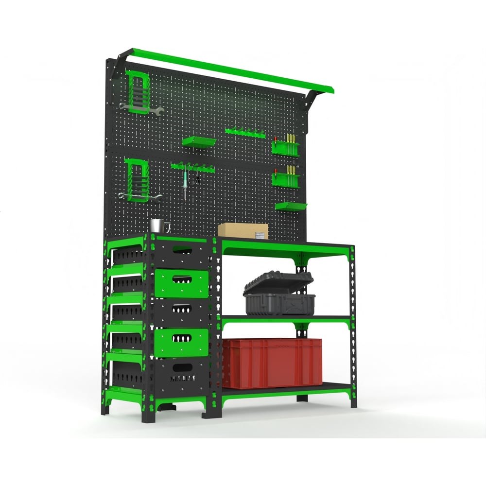 Верстак подойдет для небольшой мастерской или производственного помещения. Помимо самой столешницы имеется: 2 полки, 2 перфопанели, комплект аксессуаров и 5 ящиков для рационального хранение различных предметов (мелких деталей, документации, инструментов). Модель оснащена комплектом освещения, который обеспечивает комфортную работу пользователя. Используется в качестве дополнительного оборудования для верстаков. Используется для организации рабочих мест на производствах, на складах, в гаражах, мастерских, автосервисах и на других объектах. Предназначен для слесарных и сборочных работ. Крепление: комбинированное. Не используются шарико-телескопические направляющие, ящики выдвигаются на основе металлических направляющих толщиной 2 мм, что позволяет увеличить нагрузку на ящики и их долговечность. Верстак выполнен: - Столешница и полки из стали толщиной 1,5 мм; - Траверсы и стойки из стали толщиной - 2 мм; -Перфопанели -0,8 мм. Максимум распределённой нагрузки на весь верстак составляет до 500 кг. Максимум распределённой нагрузки на полку составляет до 200 кг. Крепление безболтовое. Цвет: тёмно-серый+зелёный.
