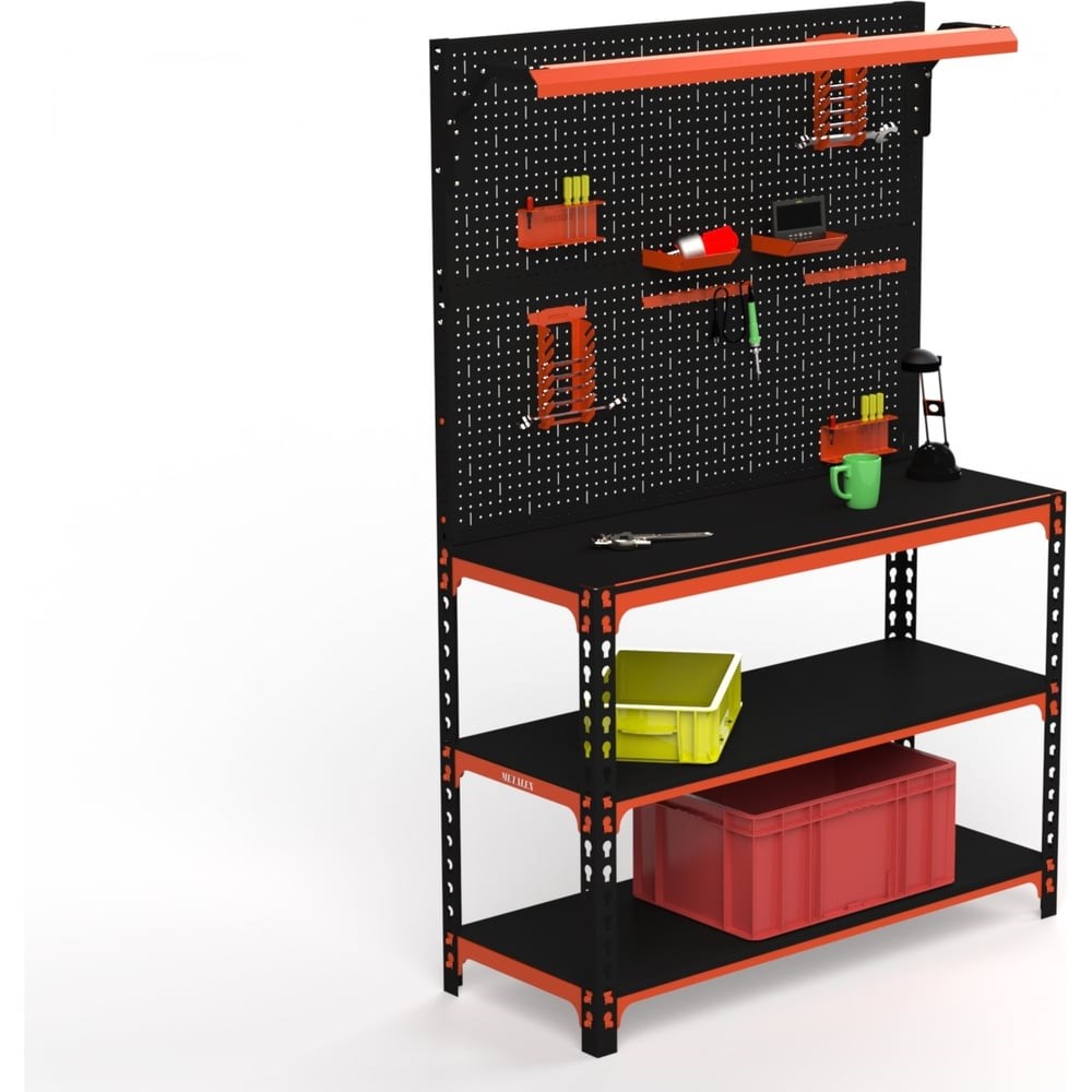 Верстак подойдет для небольшой мастерской или производственного помещения. Модель оснащена комплектом освещения, который обеспечивает комфортную работу пользователя. Перфопанель с комплектом аксессуаров является дополнительным элементом для верстака, который увеличивает рабочее пространство и структурирует хранение инструмента. Перфопанель изготовлена из стали толщиной 0.8 мм. Стол-верстак выполнен из стали толщиной 1.5 мм. Предназначен для удобной организации отдельного рабочего места на производствах, складах, гаражах, мастерских, и на других объектах. Максимум распределённой нагрузки на весь верстак составляет - до 350 кг. Максимум распределённой нагрузки на полку составляет - до 100 кг.