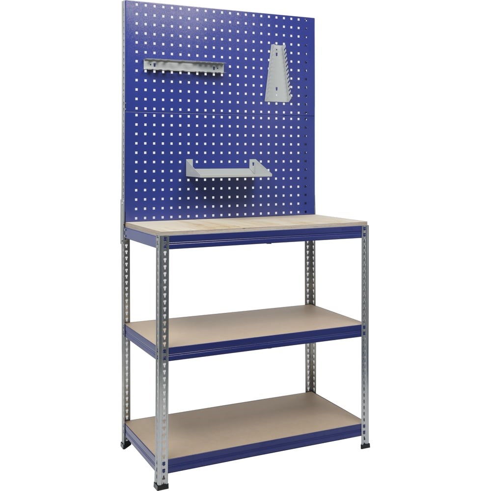 Верстак ПРАКТИК Garage Set 3 S30399501746 прост и удобен, надежен за счет качественных соединений, имеет хорошую устойчивость и прочие преимущества: Быстрая и легкая сборка Весь комплект в одной коробке Возможность установки дополнительных аксессуаров Максимальная распределенная нагрузка 450 кг Состоит из: Cтолешница - фанера 21 мм, покрытая лаком. Нагрузка 100 кг Опоры изготовлены из оцинкованных стоек, профиль36х36 мм, толщиной 0,8. Garage Set 3 оснащен двумя настилами, выполненными из Z-образных балок стеллажа SBL, с настилом ХДФ толщиной 6 мм. Нагрузка 175 кг. Верстак оснащен двумя экранами Комплект из трех аксессуаров (Держатель ключей WH, Держатель инструмента TH, Полка малая SSh)