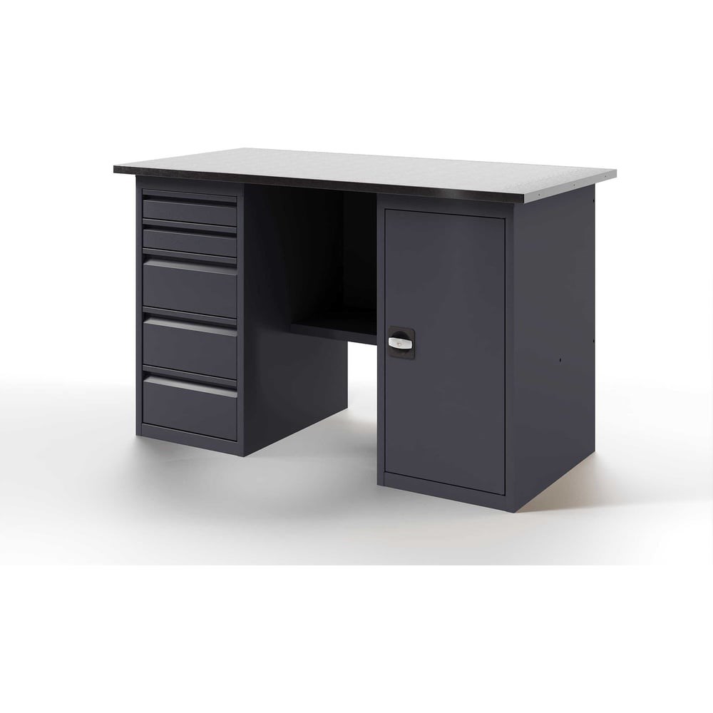 Верстак-стол - устойчивый, удобный, для слесарных, столярных работ, для производств и мастерских. Поставляется в разобранном виде. Крепкая и надежная конструкция столешницы из дерева и металла выдерживает нагрузку до 300 кг. Специальное полимерное покрытие на тумбах и полке защищает от коррозии и придает столу эстетичный вид. Надежная и прочная конструкция стола , позволяет выполнять даже силовые операции с инструментом и металлоизделиями. Столешница представляет собою плиту из фанеры толщиной 24мм, закрытую коробом из оцинкованного листа толщиной 1, 2 мм. Конструкции столешницы и короба разработаны таким образом, чтобы после сборки верстака на его рабочей поверхности отсутствовали неиспользуемые отверстия для крепежных элементов, головки болтов, заклепок и т. д. Поверхность наших столешниц идеально ровная. Это обеспечивает дополнительный комфорт пользователю. Цвет серый RAL 7024.