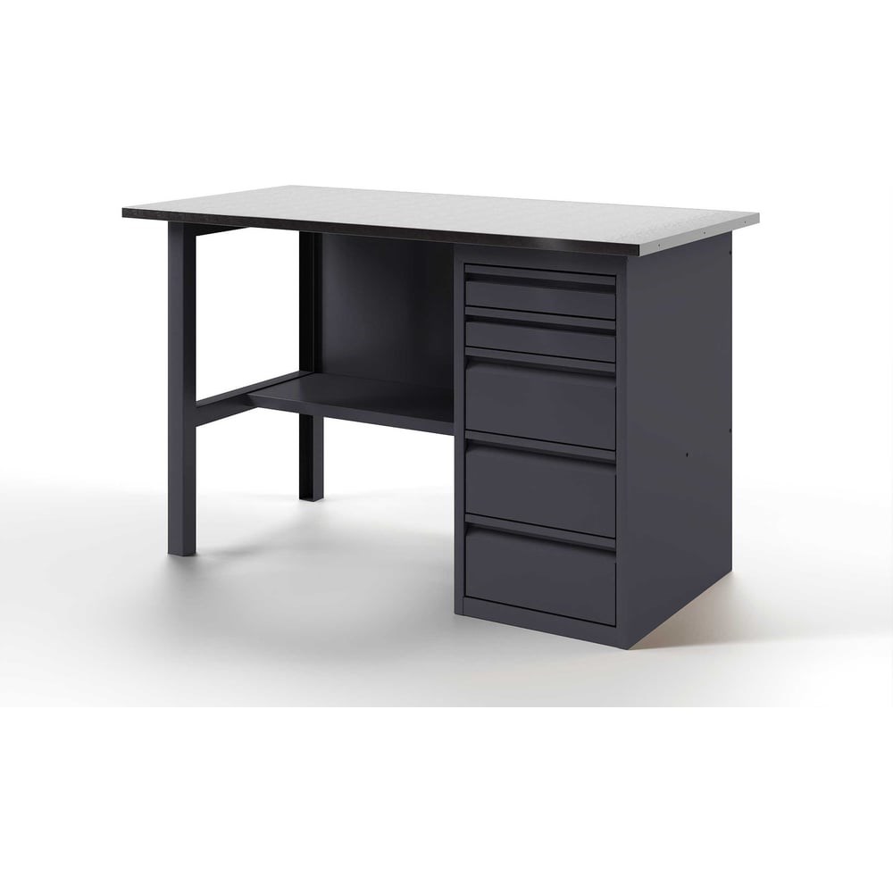 Верстак-стол - устойчивый, удобный, для слесарных, столярных работ, для производств и мастерских. Поставляется в разобранном виде. Крепкая и надежная конструкция столешницы из дерева и металла выдерживает нагрузку до 300 кг. Специальное полимерное покрытие на тумбах и полке защищает от коррозии и придает столу эстетичный вид. Надежная и прочная конструкция стола , позволяет выполнять даже силовые операции с инструментом и металлоизделиями. Столешница представляет собою плиту из МДФ толщиной 24мм, закрытую коробом из оцинкованного листа толщиной 1, 2 мм. Конструкции столешницы и короба разработаны таким образом, чтобы после сборки верстака на его рабочей поверхности отсутствовали неиспользуемые отверстия для крепежных элементов, головки болтов, заклепок и т. д. Поверхность наших столешниц идеально ровная. Это обеспечивает дополнительный комфорт пользователю. Опора для верстаков и столов из холоднокатаной стали 1, 5 мм. согнутой в П-образный профиль. Цвет серый RAL 7024.