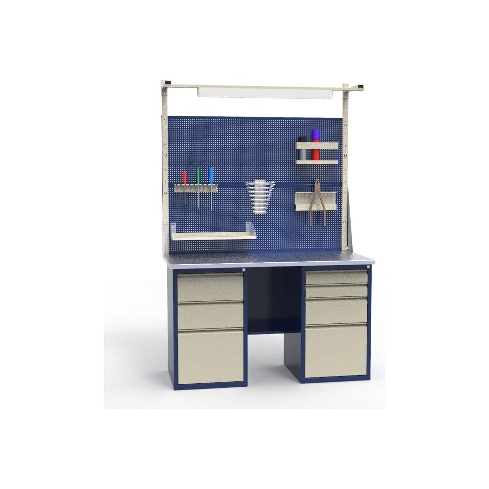 Верстак Святогор – это рабочий стол для слесарей. Он выдерживает большую нагрузку: до 1 тонны. Модель подойдет для использования в мастерских, автомастерских и на заводах, где к слесарным верстакам применяются особые требования по нагрузке. Все детали, изготовленные из холоднокатаной стали толщиной 1 мм, окрашены порошковыми эпокси-полиэфирными глянцевыми красками, что позволяет легко удалять загрязнения с поверхности. Столешница выполнена из фанеры толщиной 21 мм и оцинкованного листа толщиной 2 мм. В тумбе с выдвижными ящиками установлены шариковые телескопические направляющие, обеспечивающие плавное выдвижение.