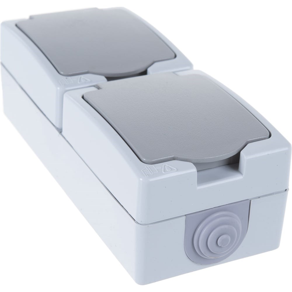 Вертикальная розетка, 2 гнезда UNIVersal Аллегро с/з, з/ш, IP54, с крышкой, серая 1275 - накладное электротехническое изделие в пластике нейтрального серого цвета. Изделие защищено от пыли и влаги, оснащено гермовводами, заземляющими контактами и отдельной крышкой для каждого гнезда.