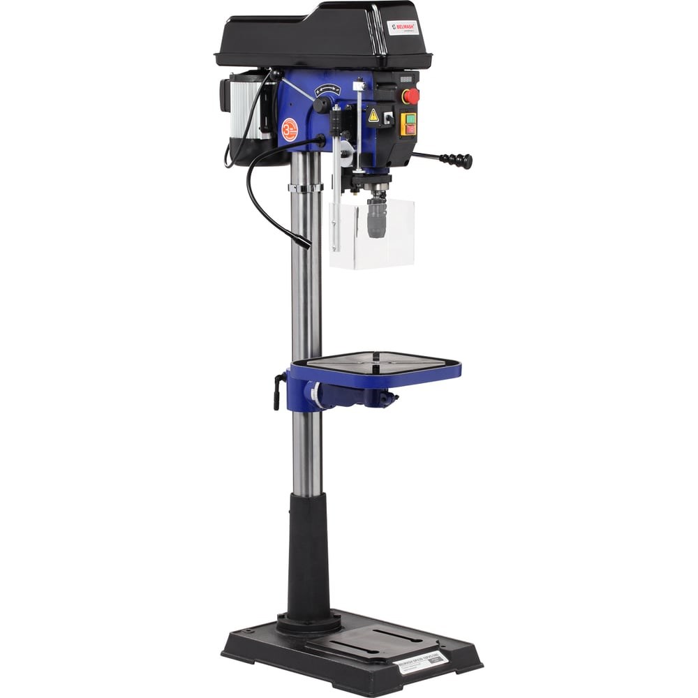 Станок предназначен для обработки различных материалов вращающимся режущим или шлифующим инструментом, с целью получения сквозных или глухих отверстий, растачивания, зенкерования. Стол, опора и корпус сверлильной головки выполнены из чугуна, что придает станку серьезный вес. Установка напольная. На основании имеется четыре отверстия для дополнительной фиксации станка.Двигатель асинхронный, мощный, 1100 Вт. Подключение к сети 400 В. Благодаря вариатору станок имеет диапазон скорости вращения шпинделя от 200 до 2200 об./мин., что необходимо при различных операциях и материалах. Рукоятка регулировки выведена на левый торец сверлильной головки.Заготовку можно крепить как к рабочему столу, так и к основанию. В комплекте предусмотрены тиски. Для их крепления есть четыре Т-образных паза на рабочем столе и два паза на основании.Максимальный ход пиноли шпинделя 150 мм. Возможно ограничение хода пиноли, путем перемещения стопора по планке. Наконечники тройной рукояти удобной формы, что способствует плавной подаче сверла к заготовке.Патрон быстрозажимной с максимальным диаметром зажимаемого хвостовика инструмента 16 мм, посадка B16. На колонне (её диаметр 80 мм) имеется зубчатая рейка для плавного поднятия/опускания стола, его положение настраивается с помощью рукоятки.Следует обращать внимание на защитный экран и крышку ременной передачи, при их открытом состоянии станок не запустится, так как установлены микровыключатели.