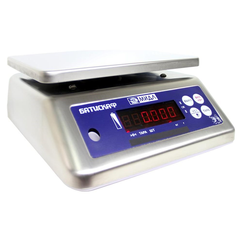 Весы настольные, фасовочные типа "МТ" торговой серии «Батискаф» предназначены для взвешивания продуктов питания, рыбопродуктов на предприятиях торговли и общественного питания в условиях повышенной влажности Регистрационный номер Государственного Реестра СИ РФ № 52873-13 Свидетельство утверждения типа средств измерений RU.C.28.004.A № 50033/1. Весы изготовлены в соответствии с ГОСТ OIML R 76-1-2011. МАХ=15кг (максимальный предел взвешивания). MIN=40г. Поверочное деление e=2/5г. Класс точности III. Функции: дозирование, счетная функция, простое взвешивание. Корпус из нержавеющей стали. Платформа из нержавеющей стали размером 225х185. Светодиодная двухсторонняя индикация. Количество разрядов индикации - 5. Питание от сети 220В и от встроенного аккумулятора. Класс пылевлагозащиты IP 68 по ГОСТ 14254 (для мойки под высоким давлением). Диапазон рабочих температур -10 +40 град С. Габариты весов 275х335х135. Отметка о первичной поверке в паспорте весов.