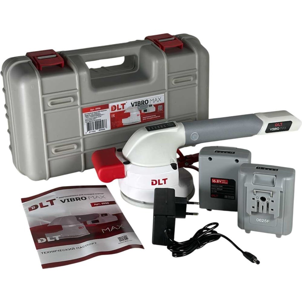 Вибрационная присоска (виброприсоска) DLT Vibro MAX – это многофункциональная машинка для укладки, выравнивания с вибрацией и переноски плитки. Специально разработана для манипуляций и подъёма плитки с гладкой и шероховатой поверхностью, а также с небольшим рельефом. Используется для переноски и установки напольной и настенной плитки, что значительно повышает эффективность работы. Это устройство 2 в 1: присоска и минивибратор. Предназначена для уплотнения основания и удаления воздуха из-под плитки во время укладки. Это обеспечивает идеальную адгезию плитки к полу или стене. Небольшой размер и легкий вес делает данный инструмент очень удобным в использование. Постоянная и равномерно распределенная вибрация позволяет не повредить плиту, даже если в ней были выполнены отверстия или разрезы больших размеров. Частота вибрации регулируется, в соответствии с размером плитки, что значительно повышает эффективность работ. Присоска представляет собой чашу из прочного алюминия, внутри которой помещена прочная резиновая нескользящая мембрана, обеспечивающая разряжение необходимое для надежного удержания изделий весом до 40кг. Диаметр чаши 112мм. Разряжение в ней создается и снимается одним нажатием рычажка. Изготавливается из прочного технического полимера. Эргономичная рукоятка разработана для большего удобства и безопасности работ. Работает виброприсоска от сменного литий-ионного аккумулятора (Li-ion) 16.8V, 2000mAh. На корпусе есть индикатор уровня заряда. В комплекте 2 аккумулятора.