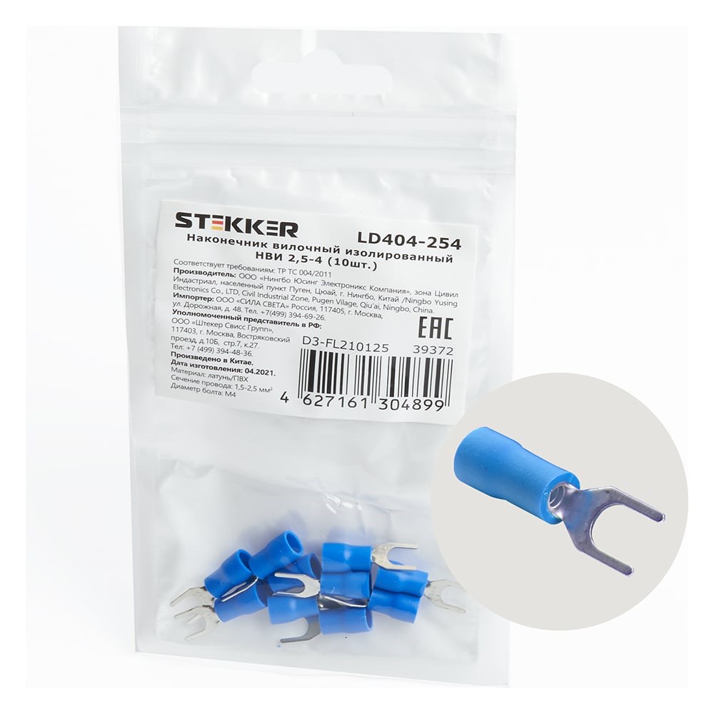 Наконечник вилочный изолированный для сечения проводов 2,5-4 мм2, размер болта М4; Материал изготовления наконечника: латунь, поливинилхлорид (PVC), цвет - синий, DIY упаковка 10 шт. Максимальный ток 27А. Наконечники рожковые или вилочные имеют разный внешний вид, но одинаковы по сути. Площадь контакта у них меньше, зато они очень удобны при частых переключениях. Нет необходимости полностью развинчивать винт каждый раз. Требуют использования специального кримпера для обжима.