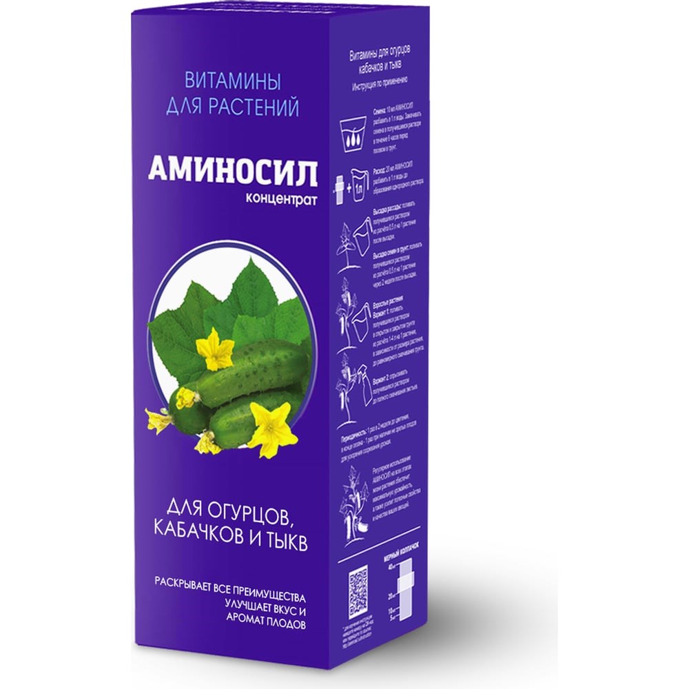 Витамины Аминосил — идеальное решение для ухода, питания и удобрения огурцов, кабачков и тыкв всех сортов. Они содержат органические витамины, макро- и микроэлементы, а также 40+ аминокислот, что делает их незаменимыми для здоровья и урожайности этих культур.Удобрение укрепляет завязи, ускоряет созревание плодов и укрепляет иммунитет растений, защищая их от болезней. Благодаря своему 100% органическому составу и безопасности для людей и животных, Аминосил обеспечивает вкусный и полезный урожай без использования химических средств.Специально разработанная формула подкормки способствует сбалансированному развитию рассады, что гарантирует высокие урожаи и качество продукции.Состав: Азот - 2%, Фосфор - 1,5%, Калий - 2,3%, магний, железо, кальций, медь, цинк, марганец, сера, бор, молибден, гуминовые вещества + 40 аминокислот
