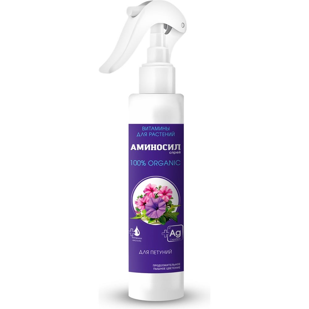 Витамины для петуний в форме спрея — АМИНОСИЛГОРЯЧАЯ НОВИНКА! Готовый к применению спрей АМИНОСИЛ предназначен для ухода за петуниями и другими балконными цветами, обеспечивая им все необходимые витамины для здоровья и красоты.Преимущества использования АМИНОСИЛ:Укрепление иммунитета:Способствует повышению устойчивости растений к стрессовым условиям и заболеваниям.Обильное цветение:Увеличивает количество цветоносов и бутонов, обеспечивая продолжительное и яркое цветение ампельных, каскадных, кустовых и махровых петуний.Полное усвоение:Формула спрея полностью усваивается растениями, что способствует формированию крепкого иммунитета.Безопасность:Продукт безопасен для людей и животных, что делает его идеальным для использования в домашних условиях.АМИНОСИЛ — ваш надежный помощник в уходе за петуниями. Обеспечьте своим растениям здоровье, яркое цветение и устойчивость к стрессам с помощью этого инновационного продукта!Состав: Азот - 0,02%, Фосфор - 0,02%, Калий - 0,025%, магний, железо, кальций, медь, цинк, марганец, сера, бор, молибден, ионизированная вода, гуминовые вещества, янтарная кислота - менее 5%, природное серебро