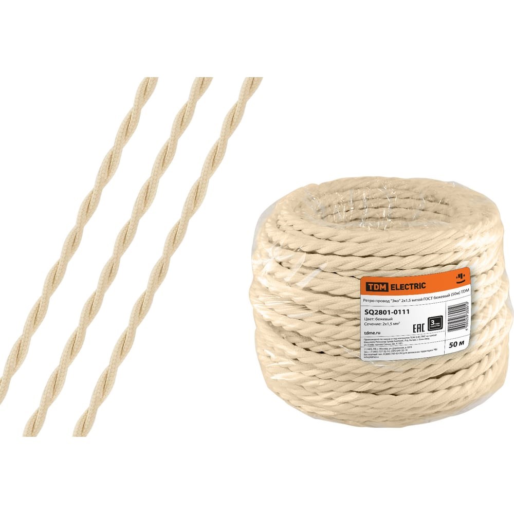 Ретро провод TDM ELECTRIC "Эко" 2x1,5 витой ГОСТ бежевый 50м SQ2801-0111 применяется для открытого монтажа проводки в стиле ретро, передачи и распределения электрической энергии на номинальное переменное напряжение до 450/750 В. Идеально подходит для деревянных домов, где провода нельзя монтировать в стены. Возможность прокладки в строящихся деревянных домах, нет необходимости ждать усадки дома. Возможность создания стильного интерьера в помещениях декорированных деревом. Провод соответствует ГОСТ 31947-2012. Соответствует требованиям пожарной безопасности ГОСТ 31565-2012.
