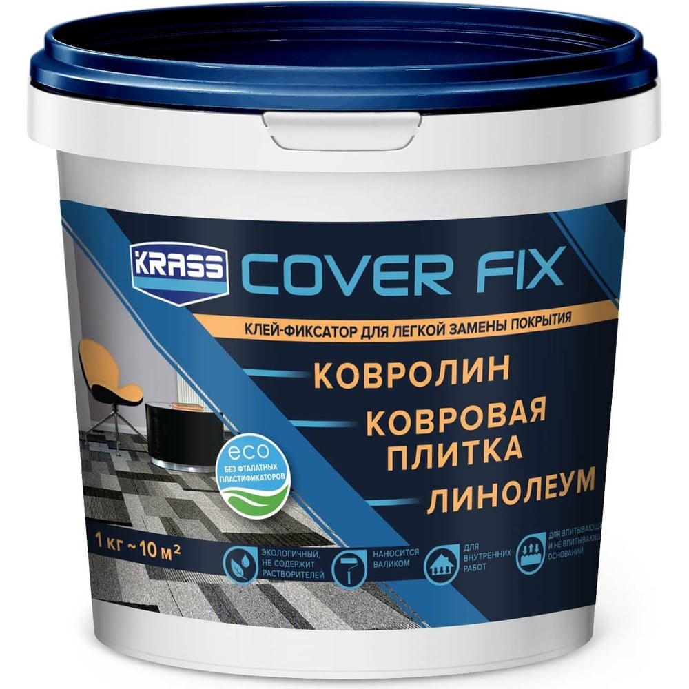 Клей-фиксатор для гибких напольных покрытий KRASS водно-дисперсионный, 1 кг Лк-00012448 предназначен для фиксации (крепления с возможностью легкой замены покрытия без повреждения основания): модульная ковровая плитка, рулонные покрытия на вспененной, войлочной, текстильной или нетканой основе, декоративные коврики. Рекомендован для помещений, в которых предусмотрена периодическая смена покрытий (выставочные центры и шоу-румы), частичная замена модульных покрытий ввиду быстрого износа, частый демонтаж покрытия для доступа к коммуникациям (система фальшполов).