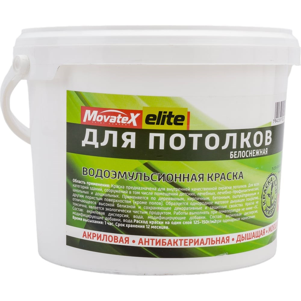 Водоэмульсионная краска для потолков Movatex elite 4,5 кг Т11889 предназначена для декоративного окрашивания пористых оснований (дерево, кирпич, бетон, штукатурка). Экологически чистый состав не токсичен и подходит для всех категорий зданий и сооружений, в том числе детских, лечебно-профилактических, школьных и дошкольных учреждений. Продукт легко наносится и быстро сохнет, образуя однородное "дышащее" покрытие.