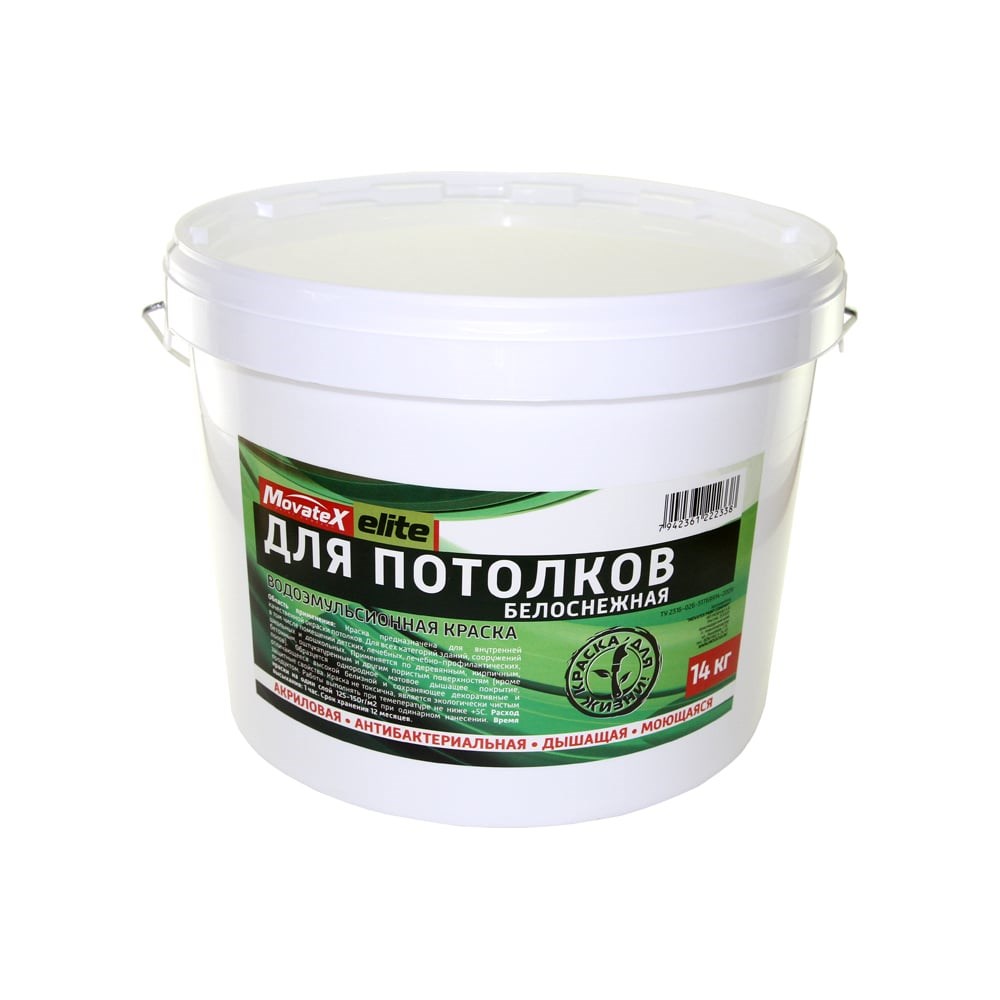Водоэмульсионная краска для потолков Movatex elite 14 кг Т11892 предназначена для декоративного окрашивания пористых оснований (дерево, кирпич, бетон, штукатурка). Экологически чистый состав не токсичен и подходит для всех категорий зданий и сооружений, в том числе детских, лечебно-профилактических, школьных и дошкольных учреждений. Продукт легко наносится и быстро сохнет, образуя однородное "дышащее" покрытие.