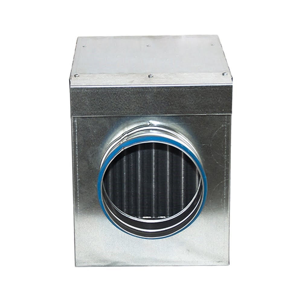 Теплообменник состоит из одного или более рядов медных трубок с внешним диаметром 12 мм, оребренных теплообменными элементами в виде гофрированных пластин из алюминиевой фольги толщиной 0,12…0,25 мм. Трубки объединены в группы, концы которых впаяны в коллекторы из стальных или медных труб, через которые осуществляется вход и выход теплоносителя или хладагента. Для соединения с внешней системой на коллекторах имеются специальные патрубки, обеспечивающие сварное, резьбовое или фланцевое соединение. Нагрев или охлаждение воздуха происходит при его прохождении через теплообменник в процессе взаимодействия с медными трубками и алюминиевыми пластинами. Конструкция водяных теплообменников позволяет обеспечить как прямоточную (направление движения воздуха и энергоносителя совпадают), так и противоточную (направление движения воздуха и энергоносителя противоположны) схемы подключения воды.